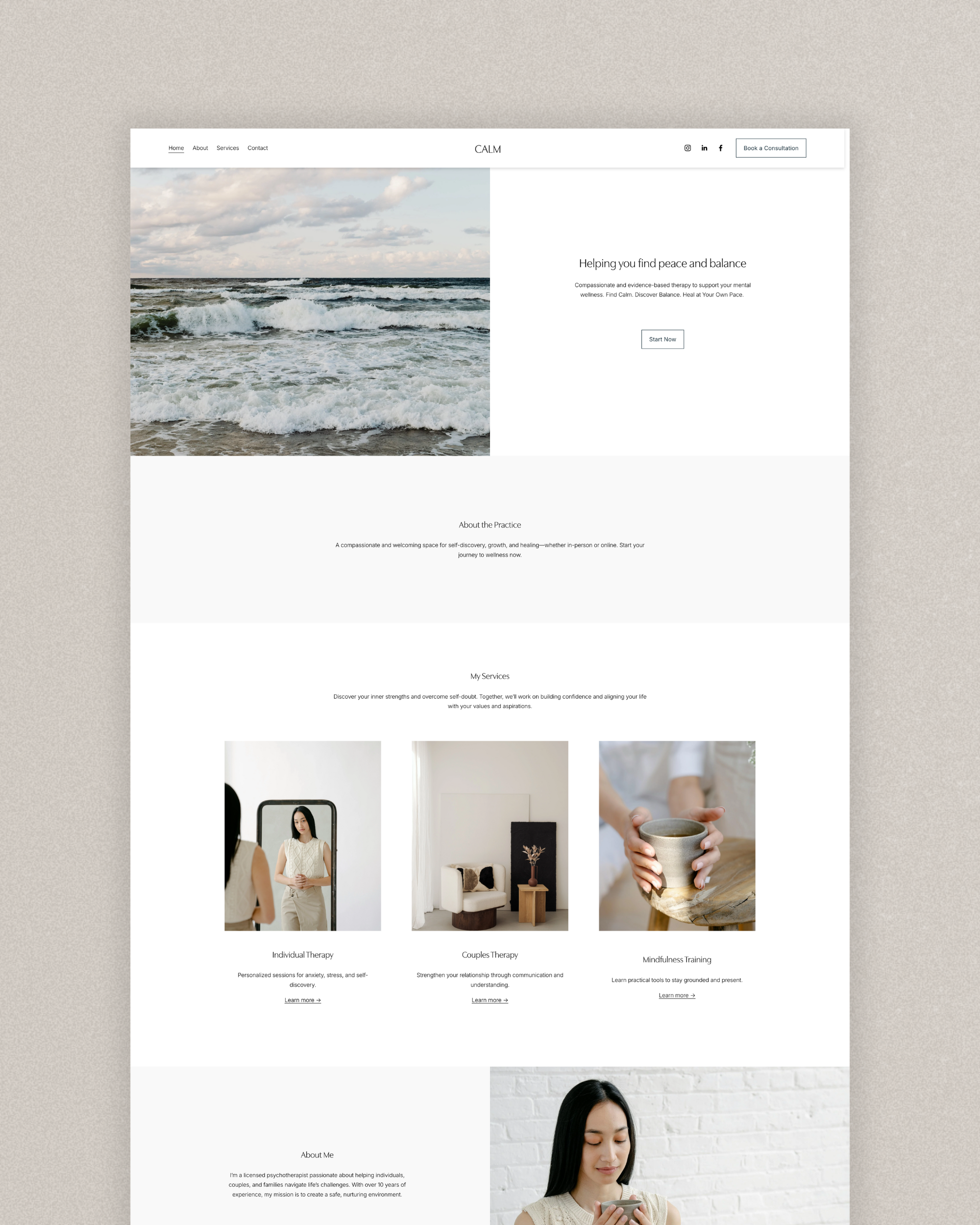 A strategically designed website template for therapists, coaches, and psychologists, built to showcase your services and inspire more bookings.